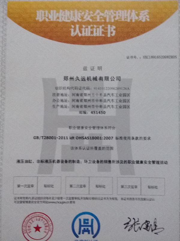 職業健康安全管理體系認證證書